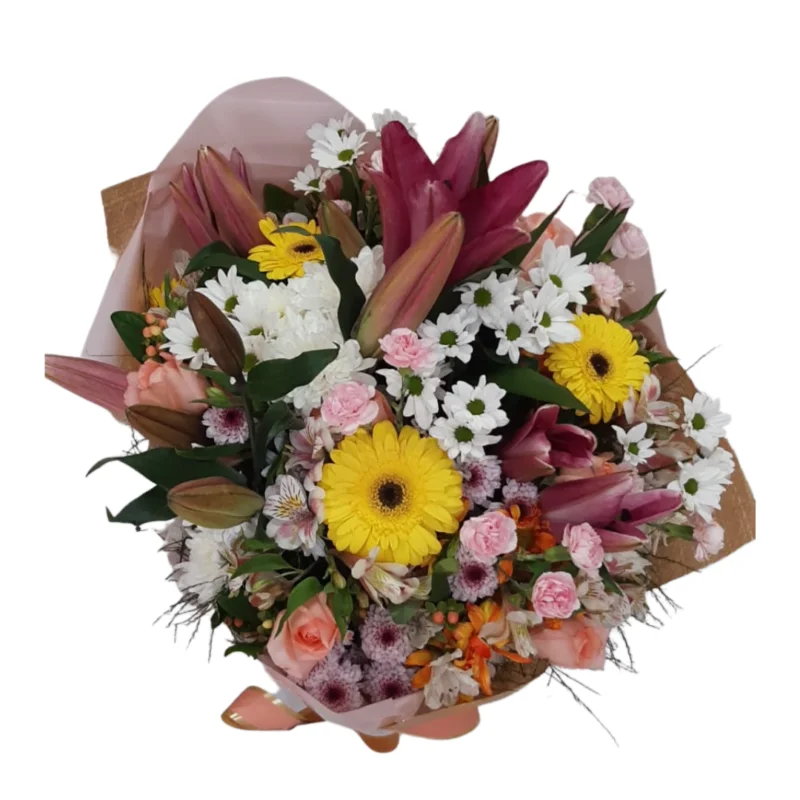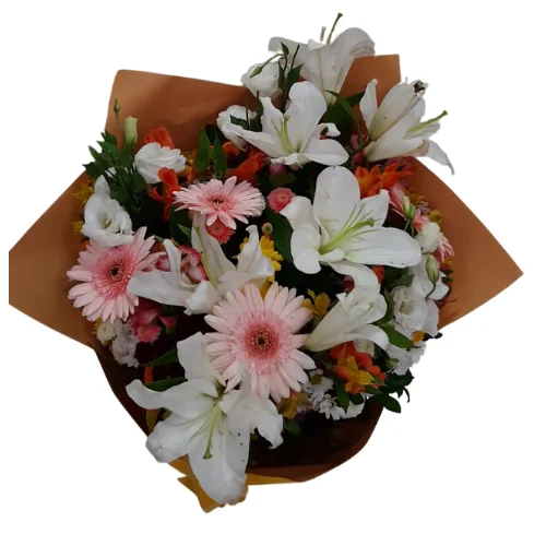 Buquê Beleza Rara , com Lírios, Alstroemérias, Rosas e Flores de Campo